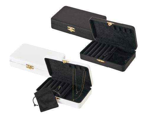 BOX & POUCHボックス&ポーチ 小型の全アイテムを見る PDFカタログを見る カテゴリーBOX & POUCH サブカテゴリーJewelry Box シリーズ小型 品番J170CA 用途宝石箱 ポーチ付 素材合成レザー その他仕様 サイズ177×114×41 カラー白・黒 台紙カラー黒 外箱かぶせ式 白マット紙・黒マット紙 単価¥4,320 入数6 ネーム入れ単価@30 ネーム入れロット6